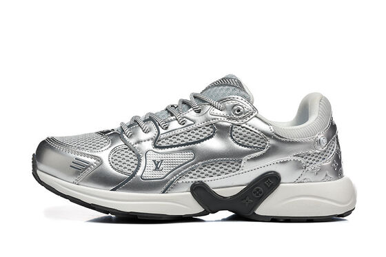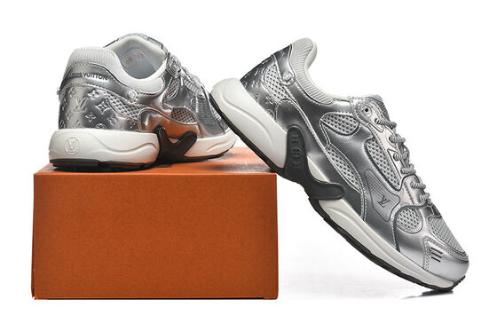 Μεταλλική ασημένια επιφάνεια με μάρκα LV (Louis Vuitton).